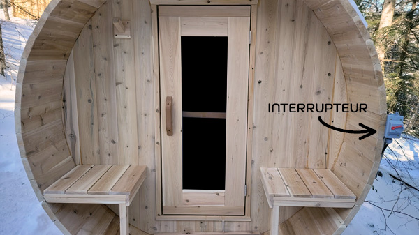 - Pour allumer la lumière à l’intérieur du sauna, faites basculer l’interrupteur rouge vers le haut. Celui-ci est situé du côté droit, à l’extérieur du sauna.