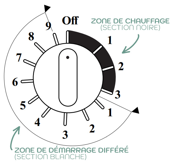 Pour retarder le démarrage du poêle, faites tourner le cadran de la minuterie dans la « zone de démarrage différé » blanche située entre les valeurs 1 et 9.