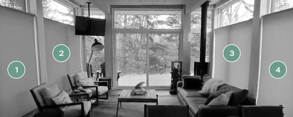 La salle de séjour est dotée de stores motorisés sans contact au cas où vous aimeriez profiter d’un peu d’intimité lorsque vous regardez un film ou relaxez près du poêle à bois.